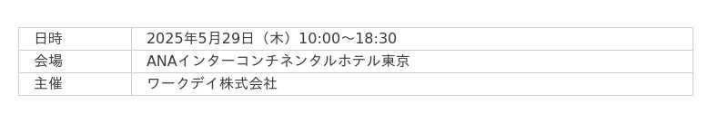 本イベントは、AIテクノロジーを中心としたWorkdayソリューションの最新情報や、Workdayのユーザーやパートナーによるセッションや展示が行われます。