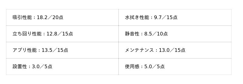 特に優秀なのが立ち回り性能で、トップを獲得。ソファとテーブル下に入り込めなかったこと以外は、どの障害物も満点だったうえ、ギリギリまで接近しつつも衝突はしない素晴らしい動きを見せました。水拭き力は全体の3位で掃除力も侮れません。また、アプリの作り込みも充実。マップに家具を設置する際、他の製品にはないスロープやカーテンも登録してマップを作り込めます。荷物や家具が多い人や、各部屋の境目に段差がある家庭に向いています。