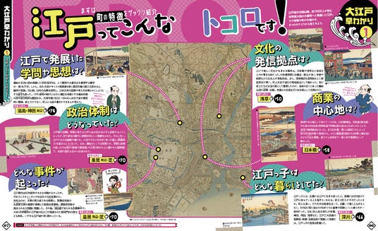 巻頭特集では、浮世絵や錦絵、写真を使った「るるぶ」ならではのビジュアル展開で、江戸時代の特徴や文化を解説しています。また江戸グルメやグッズの掲載もあり、見て、読んで、楽しめる内容です。加えて江戸時代の町人・武士の暮らしをのぞき見できるモデルコースも提案しています。