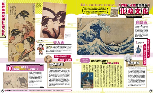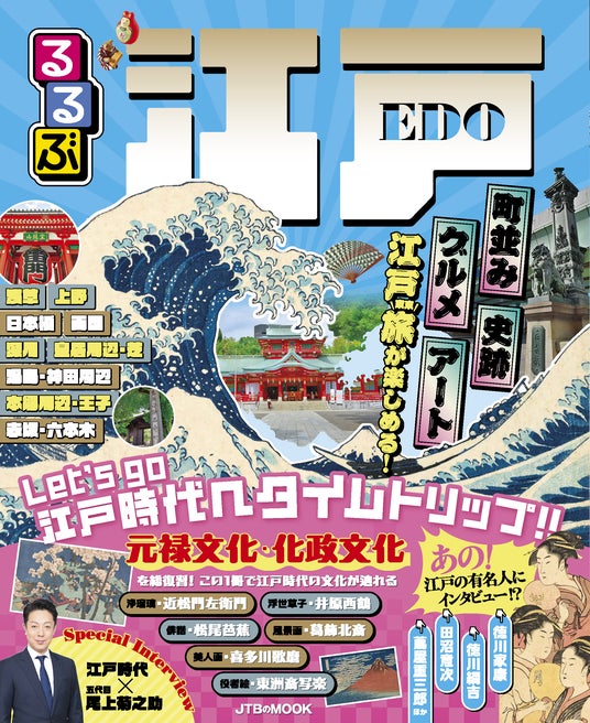 旅行ガイドブック「るるぶ」が、時を超えて江戸(現在の東京都下)&江戸時代の旅を案内します。前半部は、江戸時代のカルチャーガイドとして「元禄文化」「化政文化」を紹介。浮世絵・菱川師宣、風景画・葛飾北斎、美人画・喜多川歌麿、名所絵・歌川広重など、作品と人物を合わせて解説します。後半部は、江戸の面影を残す「浅草」「上野」「日本橋」「両国」などの町歩きを楽しめるエリアガイドです。また、巻頭インタビューでは、2025年5月に八代目尾上菊五郎を襲名する【歌舞伎俳優 五代目尾上菊之助さん】が江戸や江戸時代に対する思い、歌舞伎を通して感じる江戸の印象などを語ります。