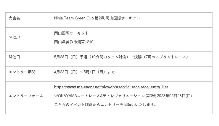 株式会社カワサキモータースジャパン(本社:兵庫県明石市、代表取締役社長:桐野 英子)は、2023年5月28日(日)に岡山国際サーキットで開催される「Ninja Team Green Cup 第2戦 岡山国際サーキット」についてお知らせいたします。
