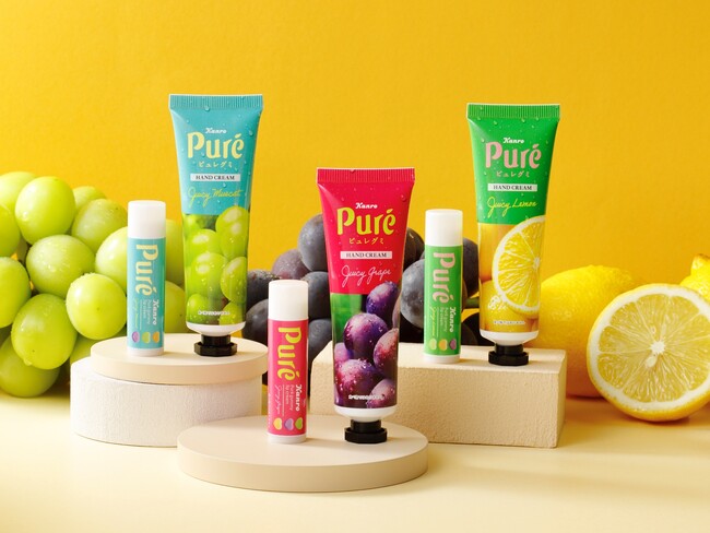 今回、ピュレグミを食べたときに広がるジューシーな香りをイメージした、“ハンドクリーム”と“リップクリーム”が登場します。バリエーションはピュレグミの定番フレーバーである“レモン”、“グレープ”、“マスカット”の3種類で、ピュレグミのフルーティーな味わいを香りで楽しむことができます。パッケージもピュレグミらしいバイカラーがおしゃれな持ち運びたくなるデザインに仕上げています。さらに、シアバター(シア脂)とヒアルロン酸(ヒアルロン酸Na)のうるおい成分を配合しており、これからの季節にぴったりのアイテムになっておりますので、ぜひお試しください。
