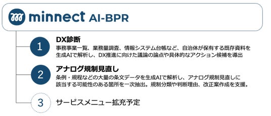 「minnect AI-BPR」は、自治体が保有している資料・規程類を活用し、生成AIによる分析と、行政分野で培ってきた当社の知見を掛け合わせることで、DX・BPRを進める上での着手点を短期間で明らかにするソリューションです。