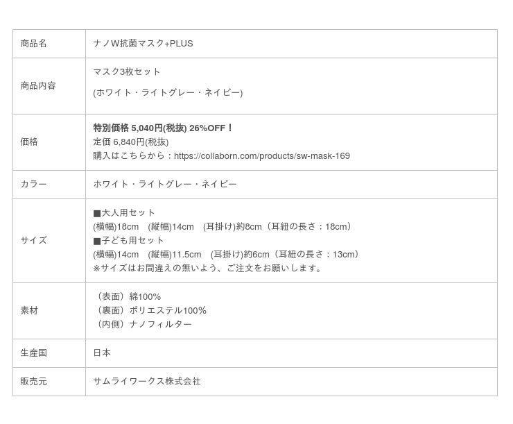 サムライワークス株式会社(代表取締役社長:新島 実 本社所在地:東京都渋谷区)は、一般的な不織布マスクよりも高いウイルス捕集力を持ち、医療用レベルで飛沫防止ができる『ナノW抗菌マスク』をさらに進化させた「ナノW抗菌マスク+PLUS」から3色セットが新発売!定価 6,840円(税抜)のところ【26%OFF】特別価格 5,040円(税抜)にてご提供致します!