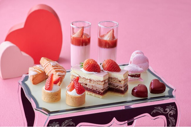 ハート型のマカロンやルビーチョコレートのケーキなど、バレンタインにもおすすめのラインナップ!テイクアウトアフタヌーンティーも同時販売