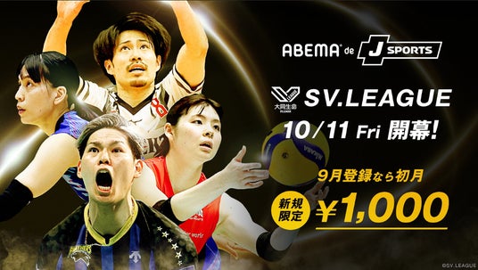 「ABEMA de J SPORTS」にて、2024年10月より開幕する国内バレーボールの新リーグ「2024-25大同生命SVリーグ」の中継決定を記念して、「ABEMA」では9月13日(金)12時~9月30日(月)23時59分まで9月限定で通常月額2,180円(税込)のところ、本プラン加入月のみ月額1,000円(税込)になります。本キャンペーンの限定価格となり、10月1日(火)以降の会員登録は、通常月額2,180円(税込)となります。