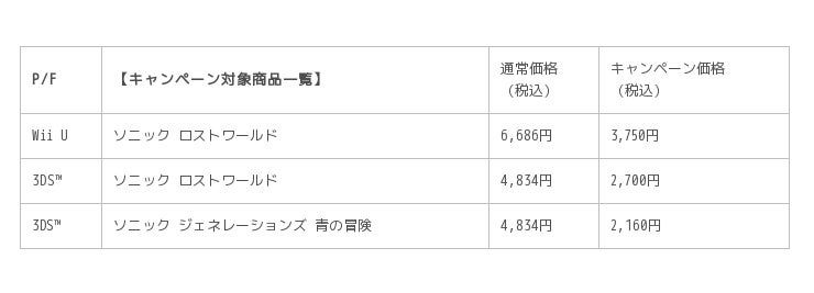 キャンペーン期間中は、Wii U™ / ニンテンドー3DS™用ソフト『ソニック ロストワールド』と、ニンテンドー3DS用ソフト『ソニック ジェネレーションズ 青の冒険』をお買い得価格でご購入いただけます。『ソニック ロストワールド』は、今回が初の値引きキャンペーン参入となります。「ソニックスプリングセール」は、15日間限定のキャンペーンです。ぜひこの機会にお買い求めください。