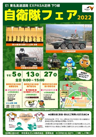 中日本エクシス株式会社 足柄支店(静岡県駿東郡小山町、支店長・谷中(たになか)伸一(しんいち))と自衛隊静岡地方協力本部(静岡県静岡市、1等空佐 武田(たけだ)恭一(きょういち))は、E1 東名高速道路(東名) EXPASA足柄(下り)(静岡県駿東郡小山町)にて、「自衛隊フェア2022」を11月5日(土)・13日(日)・27日(日)の3日間開催します。