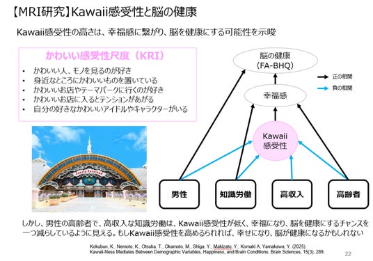 このように、サンリオエンターテイメントとブレインインパクトはそれぞれ、ビジネスパーソンのウェルビーイングの向上に向けてBHQ の活用やKawaii の活用に取り組んできました。そんな中で、MRIを用いた京都大学國分圭介特定准教授、筑波大学根本清貴准教授、山川義徳特命教授(当団体理事長)の研究※から、男性や高齢者、知識労働に従事する人はKawaii を避ける傾向にあり、得られたかもしれない幸福感を得るチャンスを逸してしまい、脳の健康維持を妨げている可能性が明らかになりました。このことから、ビジネスパーソンがKawaii に触れることによって、さらに高い仕事のパフォーマンス発揮に繋がる可能性があることが示唆されます(図2)。
