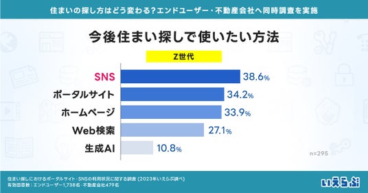 今回の調査で、SNSはZ世代の主要な情報源になっていることが分かりました。住まい探しにも同じ傾向があり、当社が2023年7月に実施した住まいの探し方に関する調査では、Z世代が「今後使いたい住まい探しの情報収集の方法」の1位はSNS(38.6%)でした。