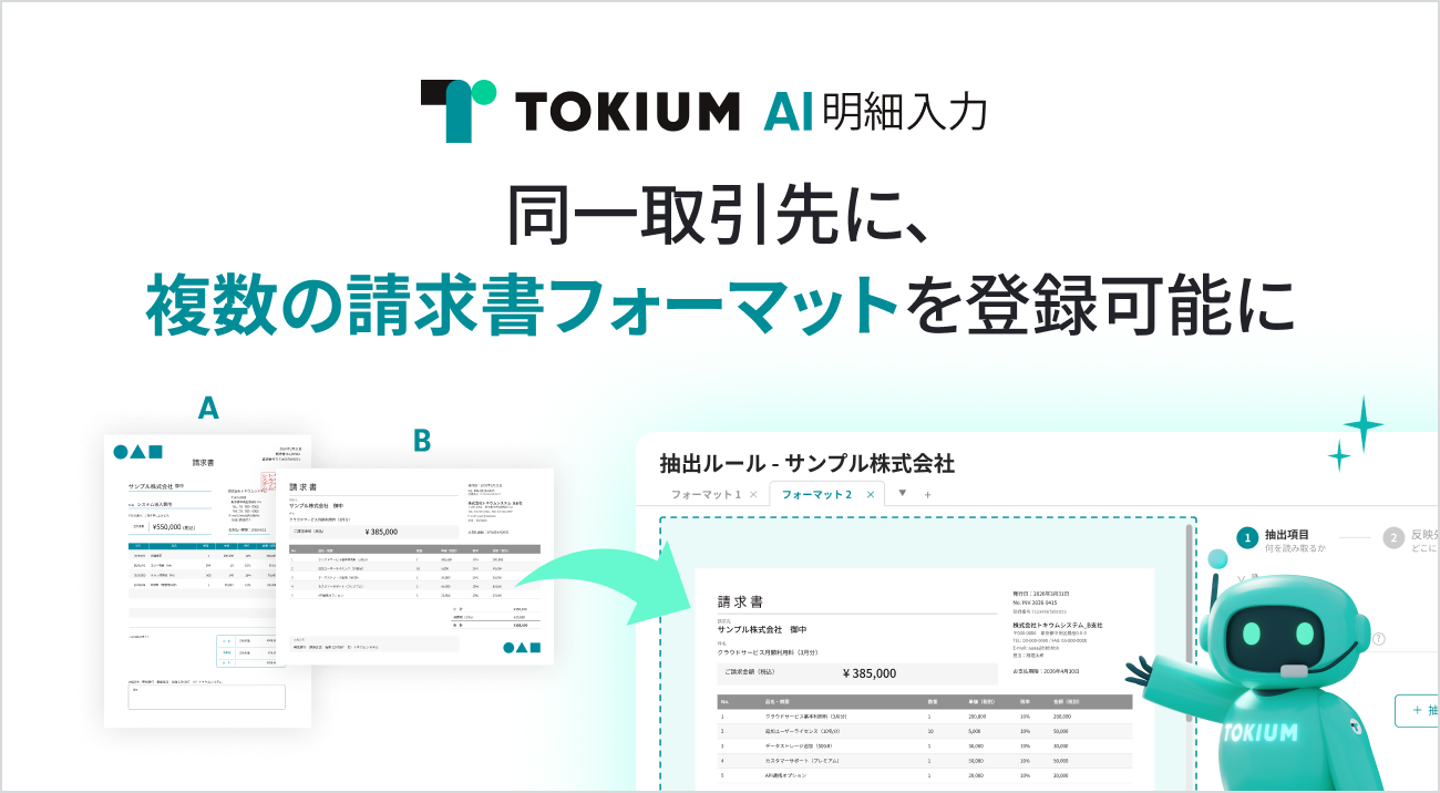 経理AIエージェントを提供する株式会社TOKIUM(本社:東京都中央区、代表取締役:黒崎賢一、以下「TOKIUM」)は、TOKIUM AI明細入力に同一取引先に対して複数の請求書フォーマットを登録できる機能を提供開始しました。これにより、同じ取引先からフォーマットが異なる請求書を受領した場合でも、別々のルールをもとに自動で仕訳入力が可能になります。