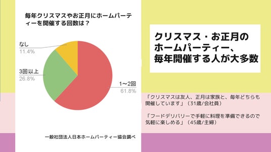 一般社団法人日本ホームパーティー協会(2012年設立)は、2024年のクリスマス、お正月のホームパーティーの実態に関する調査結果を発表しました。今回の調査では、毎年この時期にホームパーティーを開催する割合が9割を超えており、今年もすでに開催予定と考えている人が半数を超えること。内容としては、予算を抑えながらも食事や飲み物、交流を楽しみにしている実態が明らかになりました。