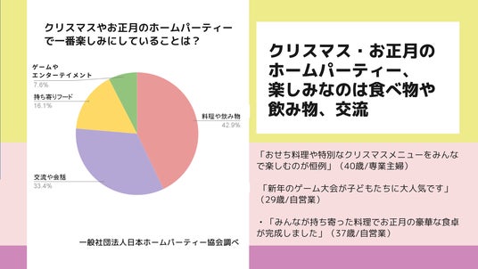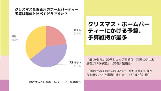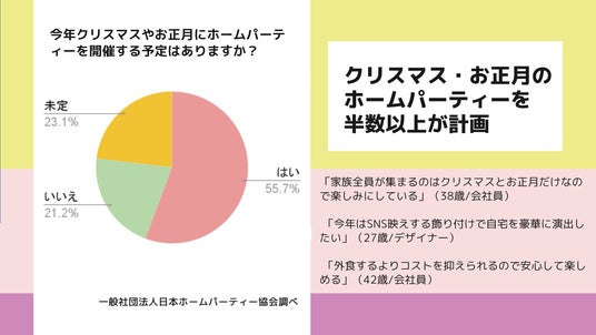 年末年始の大きなイベントであるクリスマスとお正月。今年の開催予定は半数を占め、特別なイベントならではの食事、交流、予算に対する意識の声も。~年末年始のホームパーティーに関するアンケート調査の結果~