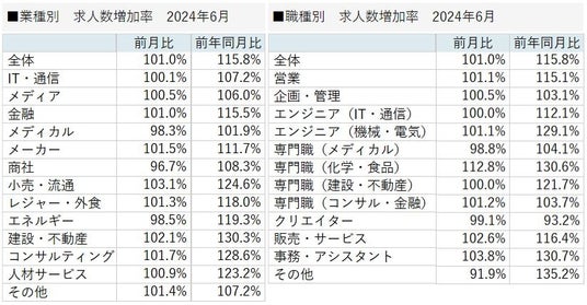 求人数は、業種別では12業種(「その他」は除外)のうち9業種で前月から増加しました。最も増加率が大きかったのは「小売・流通」(前月比103.1%)、次いで「建設・不動産」(前月比102.1%)でした。職種別では11職種(「その他」は除外)のうち7職種で前月から増加しました。最も増加率が大きかったのは「専門職(化学・食品)」(前月比112.8%)、次いで「事務・アシスタント」(前月比103.8%)でした。