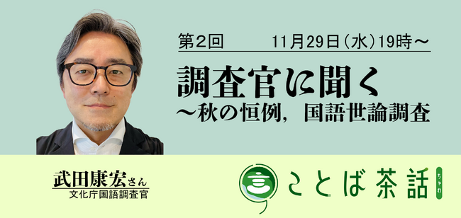 ことば茶話第2回は文化庁国語課の主任国語調査官、武田康宏さんをお迎えして、国語世論調査の裏側や、国語調査官という仕事について伺います。