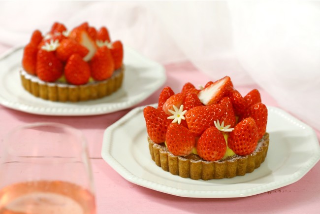 サクッと香ばしいタルト生地になめらかなカスタードクリームをしのばせ、鮮やかな苺とチョコレートのお花で、かわいらしく仕上げました。苺の程よい酸味とともに、口の中でやさしくとろけるカスタードクリームの濃厚さが相性抜群。