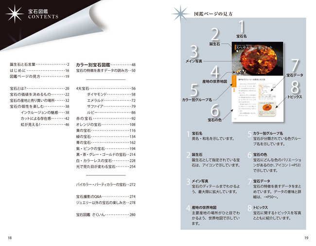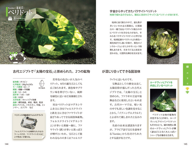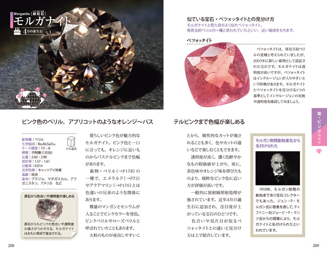 各宝石の基本データ、産地別による色の違いと等級、地質学的見地など、細かくスペック表示し、より深い宝石のテキストとして長く使用できるよう工夫しています。新基準の誕生石や、これまで見たこともない希少石まで300種超の宝石を収録しています。