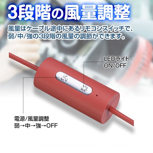 風量はケーブル途中にあるリモコンスイッチで、弱/中/強の3段階の風量の調節ができます。