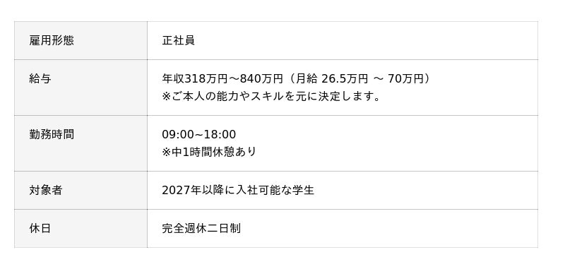 本方針は、将来の経営を担うリーダー候補だけでなく、現場で圧倒的な成果を出す「突き抜けた個」を高く評価するものです。全職種(ビジネス・エンジニア など)において、学生時代の経験やスキルに応じた柔軟な報酬提示を行います。