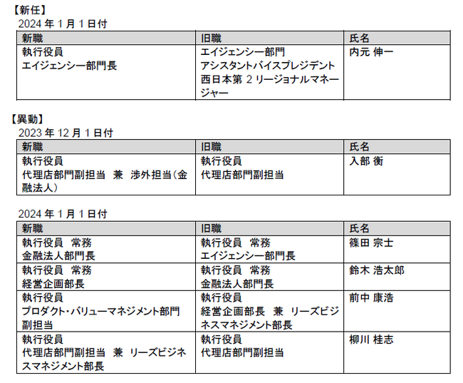 2023-11-22 メットライフ生命 人事異動(役員)のお知らせ Tweet メットライフ生命保険株式会社(代表執行役 会長 社長 最高経営責任者 ディルク・オステイン)は、 以下のとおり人事異動を決定しましたのでお知らせ致します。 ■人事異動 以上 企業プレスリリース詳細へ PR TIMESトップへ 公式ツイッター Follow @Straightpress 最新情報をTwitterで受け取ろう! 公式フェイスブックページ 最新情報をFacebookで受け取ろう! 前の記事 一覧へ戻る 次の記事