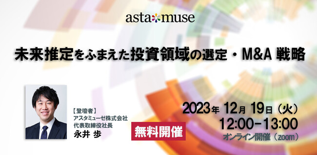 アスタミューゼ株式会社(本社:東京都千代田区、代表取締役社長 永井歩)は、2023年12月19日(火)12:00-13:00に、M&A等の投資部門、経営企画や事業企画、新規事業やR&D担当者の方々を対象とした無料ウェビナー「未来推定をふまえた投資領域の選定・M&A戦略」を開催いたします。好評のため、11月に引き続き12月にも再講演が決定しました。