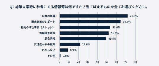 施策立案時に最も参考にする情報源は「自身の経験(71.5%)」がトップでした。一方で、「過去施策のレポート(64.7%)」や「社内の成功事例(53.6%)」「市場調査資料(51.8%)」など、データや既存ナレッジを参照している回答も一定数見られるものの、判断の起点としては個人の経験に依存する傾向が強いことがうかがえます。