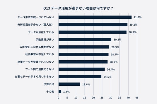 生成AIを活用している業務は「レポート作成・文章生成(56.3%)」が最も多く、施策立案や分析といった上流工程での活用は限定的であることが分かりました。上流工程では、複数のデータを横断的に扱い、構造的に理解する必要がありますが、その前提となる「データ環境の整備」が高いハードルとなっていると考えられます。