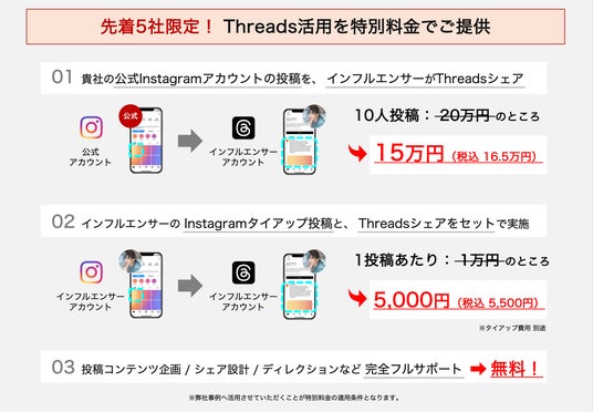 インフルエンサー スレッズ投稿10名: 15万円(通常 20万円)