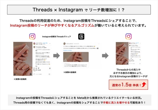 スレッズはインスタグラムとシームレスに連携しており、スレッズからのインスタグラム投稿への流入やおすすめ表示が増加しています。リデルでは、35,000人のインフルエンサーとのリレーションを活かし随時行うヒアリング調査にて、スレッズにシェアしたインスタグラムの元投稿のリーチ数が約1.5倍に伸張した事例も確認しています。“SNSのプロ” であるインフルエンサーも実感しているスレッズの影響力。これはインスタグラムアカウントを活用する企業にとっても大きな利点となり、ブランド認知拡大やエンゲージメント率の向上にも寄与すると考えております。