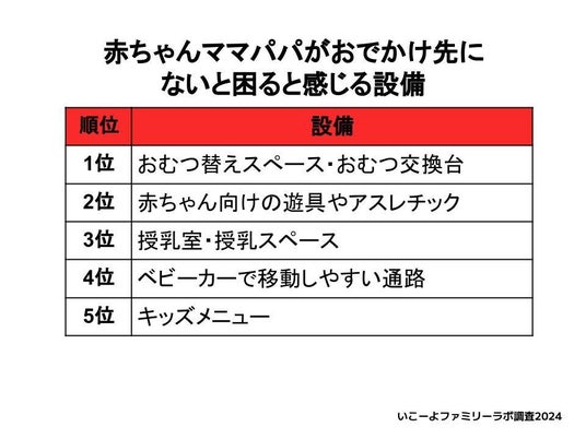 ■赤ちゃん(0歳~2歳)とのおでかけスポットにないと困る設備ランキング2024 1位はおむつ替えスペース!
