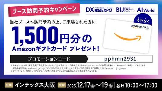 ブース訪問を事前予約の上ご来場いただいたお客様に、主催社より1,500円分のAmazonギフトカードを進呈いたします。