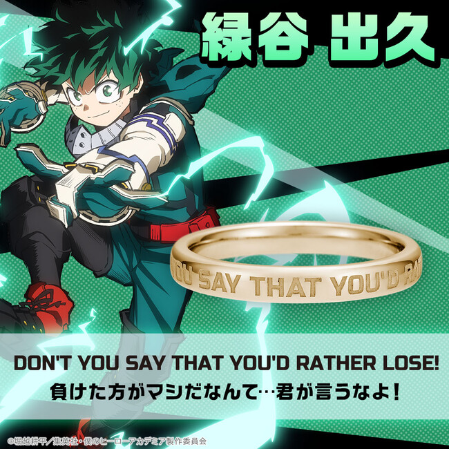 大人のための本格的なキャラクタージュエリーを扱うユートレジャー(東京都豊島区:代表取締役:伊藤 崇史)は、TVアニメ『僕のヒーローアカデミア』に登場するヒーローたちのセリフを英文で刻んだメッセージリング(指輪)5種類を、8月19日(金)~9月19日(月)の期間限定で予約受付を行ないます。このたびの新作は、緑谷出久、爆豪勝己、轟焦凍、耳郎響香、エンデヴァー、それぞれのセリフを、英語版のTVアニメよりそのまま抜粋し、刻みました。素材はシルバーとK10イエローゴールドの2種類からお選びいただけます。ユートレジャーコンセプトストア池袋、ユートレジャーオンラインショップにて取り扱います。