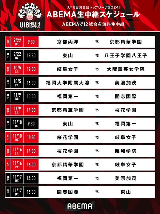 「ABEMA」にて生中継する『U18日清食品トップリーグ2024』厳選12試合のスケジュールを公開