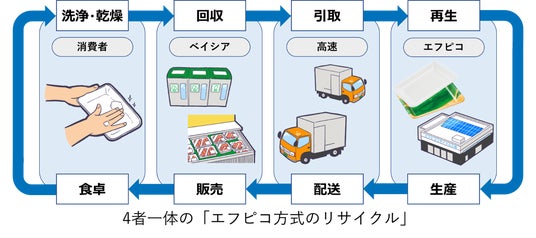 株式会社ベイシア(本社:群馬県前橋市、代表取締役社長:相木 孝仁、以下「ベイシア」)と株式会社エフピコ(本社:東京都新宿区、代表取締役会長:佐藤 守正、以下「エフピコ」)、株式会社高速(本社:宮城県仙台市、代表取締役社長執行役員:赫 裕規、以下「高速」)は、このたび、地域の環境負荷低減と持続可能な社会の実現を目指し、「エコストア協働宣言」をいたします。本協働は、ベイシアの138店舗において、食品トレーの水平リサイクル(※1)「ストアtoストア」の取り組みをさらに強化・拡大するものです。