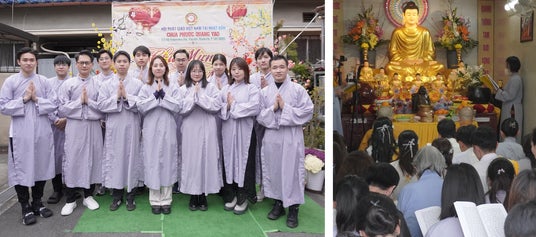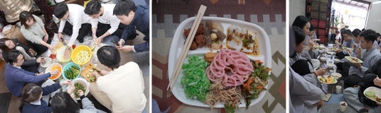 昼食の準備後は、グレーの法衣に着替え、お経を唱えたり、静かに祈りを捧げたりする時間を持ちました。祈りの時間を通じて、それぞれが新年への思いを胸に刻みました。その後、完成した昼食を皆で囲みながら交流を深めました。文化や世代を超えて同じ時間と食卓を共有することで、テトが大切にしてきた「つながり」や「分かち合い」の価値を実感する一日となりました。