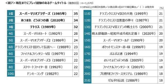 105のゲームタイトルを提示し、今までにプレイしたゲームを聴取した。「スーパーマリオブラザーズ」35%、「あつまれ 動物の森」34%、「テトリス」32%がTOP3であった。 <図7>