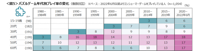 テトリスやぷよぷよなどの「パズルゲーム」は現在の40~60代のプレイ率が高いものの、30代以下の若年層では10%に満たない。<図5>