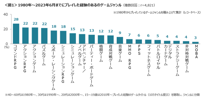 ゲーム&ウォッチが発売された1980年から現在に至るまで、プレイした経験のあるジャンルを積み上げて集計(レコードベース)した結果、「コマンドRPG」28%が最も高く、次いで「アクションRPG」「アクションゲーム」「パズルゲーム」が22%であった。上位には各世代に古くから親しまれてきたゲームジャンルがあがった。<図1>