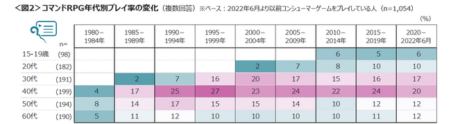 プレイ率TOP5のジャンルについて、年代別のプレイ率の変化を確認した。「コマンドRPG」は、現在の40代に長く楽しまれているジャンルといえる。スーパーファミコンの登場によりドラゴンクエストやファイナルファンタジーのシリーズがブレイクした1990年代に、当時10代~20代前半だった40代のプレイ率は高く、現在でも20%のプレイ率をキープしている。<図2>