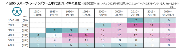 野球やサッカー、マリオカートなどの「スポーツ・レーシングゲーム」は、プレイ当時10代~20代前半中心に楽しまれていた。<図6>