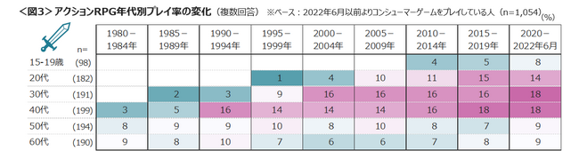 ゼルダの伝説シリーズが代表的な「アクションRPG」は、現在の20代~40代に広く遊ばれているジャンルであり、年代があがってもプレイ率は大きく変わらない。<図3>