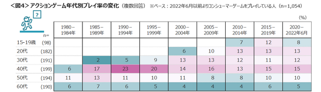 スーパーマリオブラザーズシリーズなどの「アクションゲーム」は、現在の40代(当時10代~20代前半)のプレイ率は1990年代にピークをむかえ、現在は15%にとどまる。<図4>