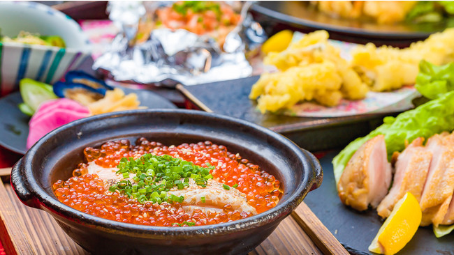 先附、お造り盛り合わせ4点、さつま純然鶏の塩焼き、本日の煮もの、豚バラとキムチのホイル焼き、本日の揚げもの、エビマヨ、鮭といくらの土鍋ご飯、デザート