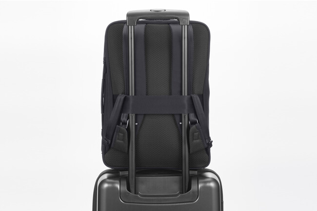 交通各社が推奨する複数の持ち方に対応しており、「手に持つ」時はトップハンドル、「棚に上げる」時はサイドハンドル、「前に抱える」時は縦・横どちら向きで抱えても取り出しやすい位置にファスナーやポケットを配置しました。また、背面には出張時に役立つセットアップベルトを備えています。