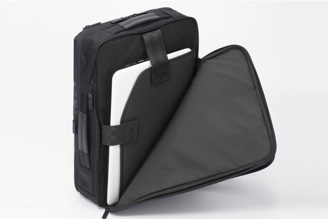 背面に独立したPC収納部を備えています。内側は柔らかなパイル生地で、ガジェットに細かな傷が付くのを防ぎます。