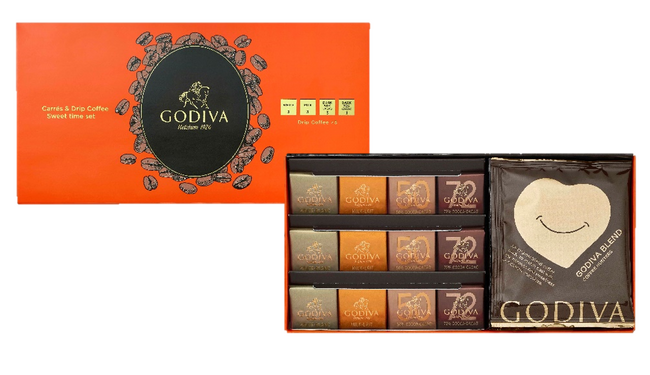 「カレ&コーヒー スイートタイムセット」は、ゴディバのチョコレートへのこだわりが際立つ、薄いスクエアタイプのチョコレート「カレ」と、ゴディバオリジナルのドリップバッグコーヒーを詰め合わせました。 「カレ ホワイト」、「カレ ミルク」、「カレ 50%ダーク」、「カレ 72%ダーク」の4種類のカレとコーヒーをお楽しみください。
