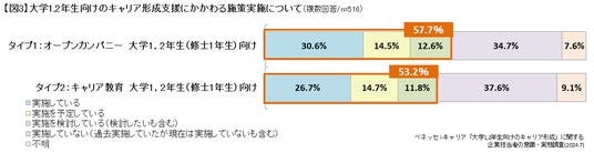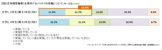 大学1,2年生向けに、就業体験・機会提供を目的とした学生アルバイトなどの有償型施策の実施(予定)について聞いたところ、「実施している」「実施を予定している」の回答合計が43.6%となりました。