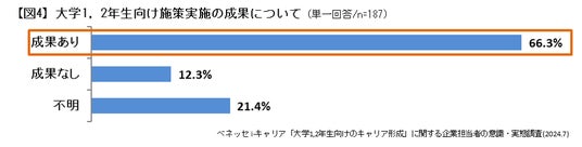 回答者が所属する企業での大学1,2年生向けの施策実施(予定)有無については、「実施している」「実施を予定している」「実施を検討している」の合計が、「タイプ1:オープンカンパニー」では57.7%、「タイプ2:キャリア教育」では53.2%となり、それぞれ半数を超える結果となりました。【図3】 また、大学1,2年生向けに実施した中で、66.3%の施策において「成果が出ている」ことも明らかになりました。【図4】