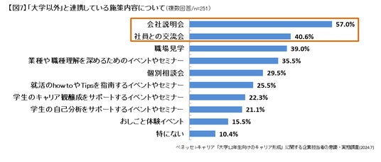 ・「大学以外」との連携施策は、1位「会社説明会」(57.0%)、2位「社員との交流会」(40.6%)で、大学以外の連携先の中で最も多かったのは「学生団体」。