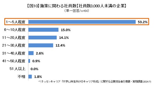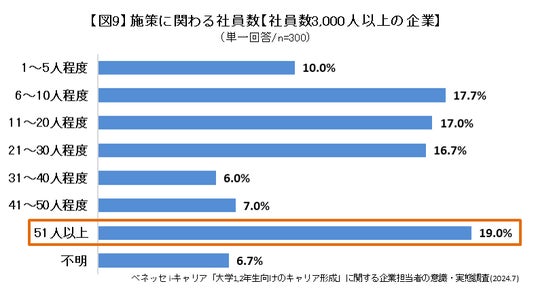 施策運営に関わる社員数を企業規模別で見ると、社員数3,000人以上の企業1位は「51人以上」(19.0%)、3,000人未満の業1位は「1~5人程度」(53.2%)という結果になりました。【図9,10】